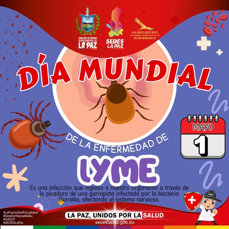 La Paz, 1 de mayo 2026.- Cada 1 de mayo se recuerda el Día Mundial de la Enfermedad de Lyme, una infección contagiosa causada por bacterias del género Borrelia burgdorferi y Borrelia mayonii. La transmisión ocurre a través de la picadura de garrapatas infectadas, que al alimentarse de la sangre humana introducen la bacteria en el organismo.